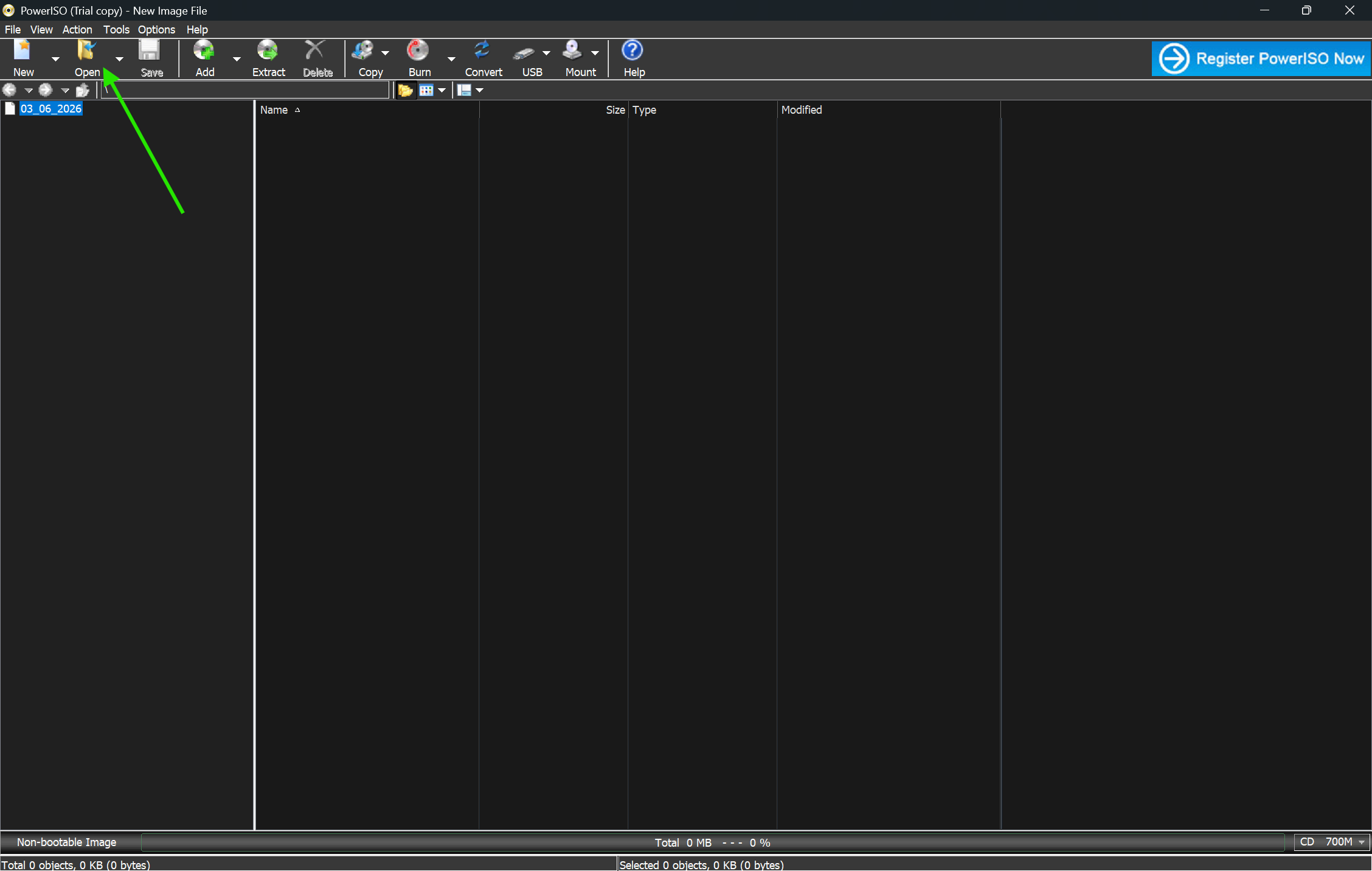 Launch PowerISO after installation. The main interface opens with a toolbar at the top and a file panel below.